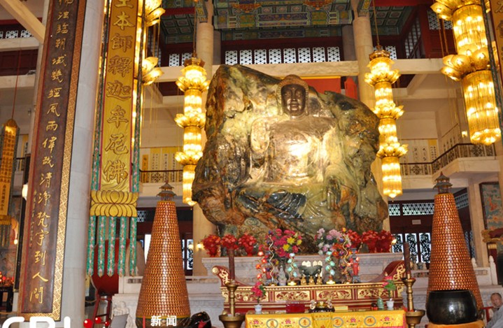 “玉石王”是一塊七彩花玉,各部位的顏色用現(xiàn)有的科學技術尚無法探明,人們擔心將佛面雕成花臉,但雕刻結束時,人們驚奇地發(fā)現(xiàn),佛祖的面部恰恰刻在一塊純凈的墨綠色玉塊上,佛面靈光,神韻倍增,而佛祖的金冠恰逢一塊淡黃色的玉面。在整體上,顏色恰巧搭配成法相莊嚴的釋迦牟尼佛身披黑白相間的袈裟,打坐在蓮花寶座上,周圍七彩祥云繚繞,給人以心靈的震撼和慰藉。同樣,觀音的面部也恰好位于一塊晶瑩剔透的淡綠色玉面上。玉佛雕刻之完美可謂巧奪天工。