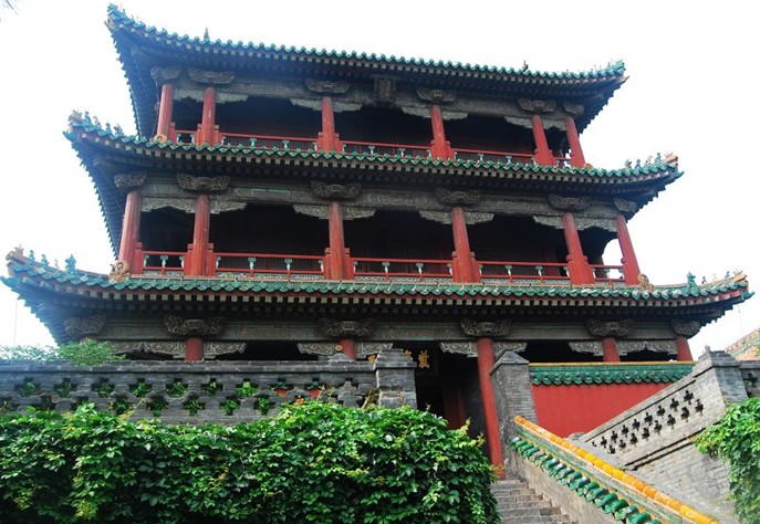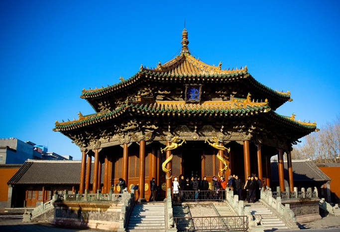 太廟:建于乾隆四十三年(1778年)。原為道教建筑景佑宮(三官?gòu)R),乾隆四十三年將城外的盛京太廟遷于此處,供奉清室先祖——肇祖、興祖、景祖、顯祖的神位。正殿面闊三間,單檐歇山頂,滿堂黃琉璃瓦,東西有配殿三間。