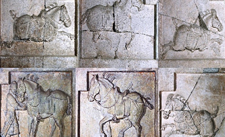 在祭壇東西兩廡房?jī)?nèi)置有6匹石刻駿馬浮雕像,馳名中外,曾有詩(shī)云:“秦王鐵騎取天下,六駿功高畫(huà)亦優(yōu)?!边@是李世民自己選定的題材。他在隋亡以后,為統(tǒng)一割據(jù)的局面,鞏固唐王朝新建的政權(quán),南征北戰(zhàn),馳騁疆場(chǎng),他騎過(guò)的六匹馬,聯(lián)系他的戰(zhàn)叻。據(jù)說(shuō)當(dāng)時(shí)擔(dān)任營(yíng)山陵使、工部尚書(shū)、著名工藝家、美術(shù)家閻立德起圖樣,由筑陵石工中的高手雕鐫而成的。這六具石雕駿馬是在平面上起圖樣,雕刻人馬形狀的半面及細(xì)部,并使高肉突起,稱之浮雕,也叫“高肉雕”。每邊三具,皆背靠后檐墻而立。據(jù)記載,原石在每塊上角有歐陽(yáng)詢書(shū)太宗自撰的馬贊詩(shī),隨后另有殷仲容隸書(shū)刻于座上,這些今俱不可見(jiàn),原詩(shī)收入《全唐文》中。六駿的名為“特勒驃”、“青騅”、“什伐赤'、“颯露紫”、“拳毛馬咼”、“白蹄烏”?,F(xiàn)存西安市碑林博物館,其中“颯露紫”、“拳毛馬咼”二駿,于1914年被盜運(yùn)美國(guó)賓夕法尼亞大學(xué)博物館。昭陵六駿刻于貞觀十年,各高2.5米,橫寬3米,皆為青石浮雕,姿態(tài)神情各異,線條簡(jiǎn)潔有力,威武雄壯,造型栩栩如生,顯示了我國(guó)唐代雕刻藝術(shù)的成就。在“颯露紫”中表現(xiàn)了唐太宗在與王世充作戰(zhàn)時(shí)為流矢所中,丘行恭進(jìn)前為他拔箭那種親切形象。昭陵的這些石刻在品類、造型及題材上,既不取生前儀衛(wèi)之形,也不用祥瑞、辟邪之意,獨(dú)具一格,所有石刻都是寫(xiě)實(shí),富有政治意義的不同凡響之作。