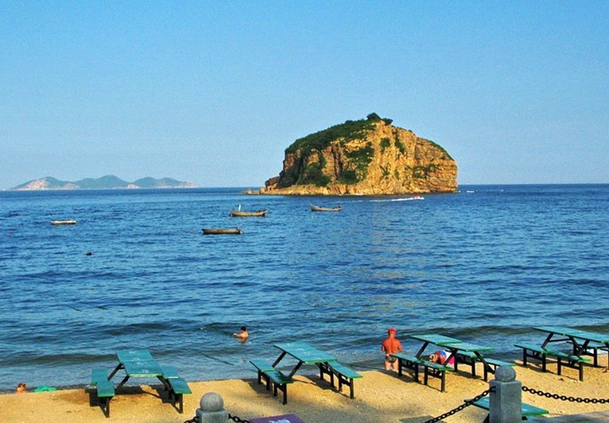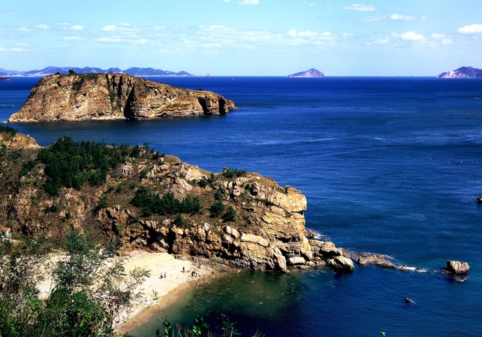 景區(qū)北部為群山環(huán)繞,蒼松翠柏。南面是開(kāi)闊的海域和平坦的沙灘,遠(yuǎn)處的三山島,云遮霧罩,恍如蓬萊。 島上岸崖陡峭,怪石嶙峋,山花野草遍及全島。