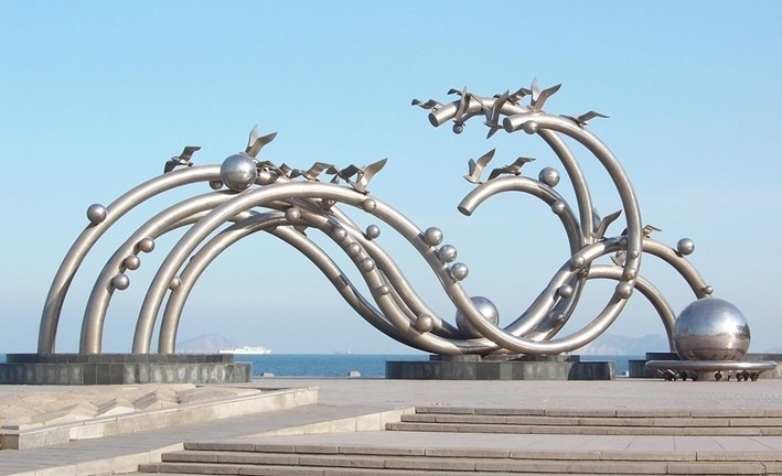 海之韻,一個(gè)富有詩(shī)意的名字,給予一個(gè)富于韻律的廣場(chǎng), 加上自然的磅礴大氣和設(shè)計(jì)者的獨(dú)具匠心造就了大連東海岸上詩(shī)情畫意的海之韻廣場(chǎng)。它與星海廣場(chǎng)遙相呼應(yīng),像兩顆明珠照亮了大連的海岸線。版權(quán)所有山東聊城聊之旅國(guó)際旅行社有限公司,轉(zhuǎn)載必究!廣場(chǎng)面積3.8萬(wàn)平方米,由13000平方米的鋪裝廣場(chǎng)、12000平方米的綠地和許多精致雕塑組成。該廣場(chǎng)的主角毫無(wú)疑問是雕塑,從西門進(jìn)入廣場(chǎng),首先奪了你視線去的就是海之韻的主題雕塑,五根曲率不同的白鋼管為主體的雕塑,據(jù)說(shuō)長(zhǎng)19.9米,象征1999年9月是大連建市100周年;21只飛翔的海鷗象征飛向21世紀(jì);50個(gè)大小不同的球體即代表原子結(jié)構(gòu),又寓意建國(guó)50周年。在我看來(lái)五根波浪般的鋼管是波浪造就的五線譜,小鋼球是跳躍的浪花,大海在譜寫它獨(dú)有的樂章,海鷗在和樂起舞,這雕塑仿佛就是對(duì)蔚藍(lán)大海的抽象寫生。