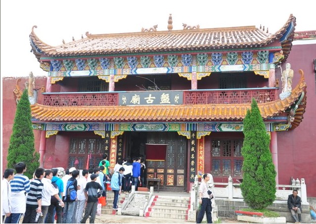 地處河北省滄州市北的青縣城南6公里有村曰“大盤古”,村西有座盤古廟。盤古廟始建于元世祖至元十五年(1278年),明弘治和崇禎年間曾重修,清康熙二十七年(1688年)因河流沖刷,設于秋祠西南重建,均有碑記。據文獻記載和民間傳說,當年的盤古廟狀似北京的故宮三殿,石、磚、木結構,琉璃瓦蓋頂,金碧輝煌,蔚為壯觀。前殿高三丈六尺,象征一年360天;臺階18級,為18層地獄之說;飛檐椽子108根,按36天罡、72地煞而布;每根椽頭系銅鈴一枚,照工、商、角、征、羽五音而置,有所謂“風搖鈴響天動樂,光照殿頂地生輝”之說。殿內有身披樹葉,手托日月的鐵鑄涂金盤古像,高一丈零八寸。中殿塑有南海觀音像,股坐蓮盆,金童玉女立兩側。版權所有山東聊城聊之旅國際旅行社有限公司,轉載必究!后殿設老君、孔子、龍王三塑像,殿前有合抱粗的合歡樹兩株,殿后鐵磬懸于古槐。可惜盤古廟在1947年毀于戰(zhàn)火。九十年代,當地群眾組織起來修復盤古勝跡,以滿足來此朝圣拜祖的人流尋訪。