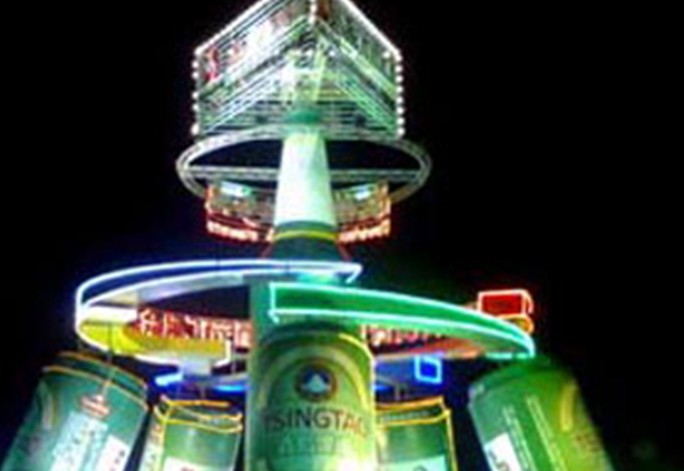 走進(jìn)啤酒城大門,可見高大的標(biāo)志性雕塑--溢滿全球。雕塑由一個(gè)大型高腳杯矗立于圓形的水池中央,高腳杯被做成為世界地圖的圖案,啤酒沫從杯中不斷地溢出,上有青島啤酒商標(biāo),寓意深刻。水池后面有一半月形石壁,上書“國(guó)際啤酒城”.夜幕降臨,彩燈、噴泉、水柱交互輝映,無比絢麗。