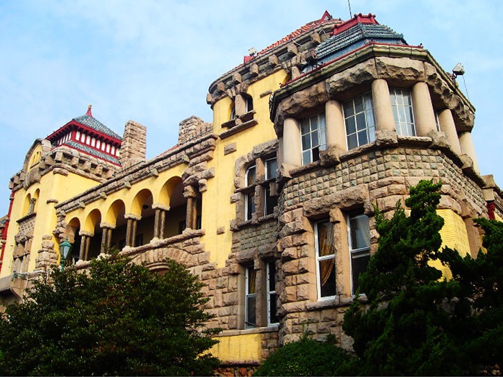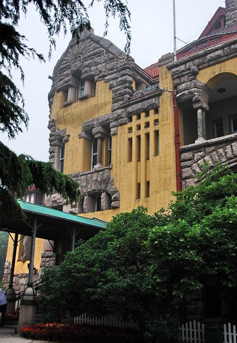 青島總督府,氣勢宏偉,建筑面積為4083平方米,高度為30米,厚達60多厘米的外墻以黃色為基調(diào),局部以花崗巖石料作裝飾,石面加工粗樸,正門墻飾以淡綠色、淡灰色花崗巖石,頂部石料雕以美麗的圖案,于粗放之中見精巧。米紅色筒瓦、藍色魚鱗瓦、綠色牛舌瓦鋪設的樓頂,使大樓更加精美別致。1957年環(huán)繞迎賓館修建了圍墻形成了占地面積達86000多平方米的庭院,院內(nèi)遍植果樹和多種觀賞植物。
