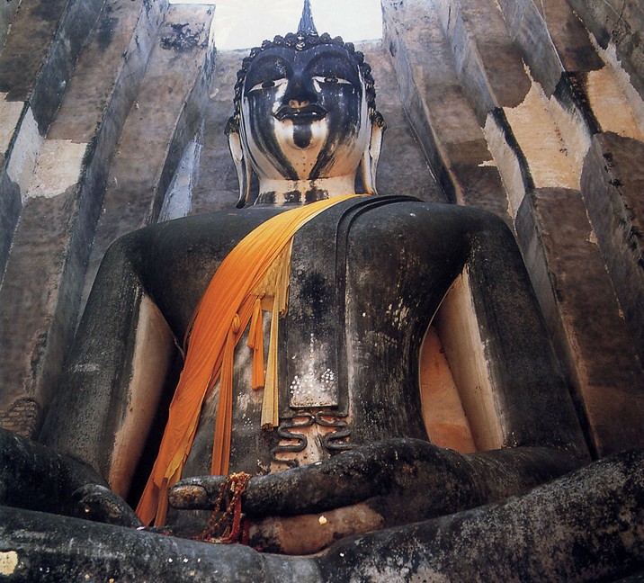 看多了斷垣殘壁,一進(jìn)西昌寺(Wat SiChum),總是立即被那恢宏的建筑、巨大的佛像震攝住。每個(gè)游客一進(jìn)門,就見著巨大的坐佛從窄門中向外凝視,這尊坐佛與藍(lán)坎亨石碑上提到的“阿迦納佛”相似,右手手指指地,呈鎮(zhèn)魔姿,高15公尺,兩膝寬11.3公尺,佛像修整得非常完美,一點(diǎn)也沒有歷經(jīng)滄桑的感覺,一般相信這尊佛像原本是露天的,后來(lái)才加蓋了廟宇。這間廟宇長(zhǎng)、寬各32公尺,高15公尺,墻厚3公尺,一般廟宇都有通道通到屋頂,左上右上,西昌寺也有,但只能左上右下,而西昌寺的另一個(gè)瑰寶就是沿著通道的天花板上有超過50幅的石板畫,描繪本生經(jīng)及佛陀10次轉(zhuǎn)世的故事,可惜現(xiàn)在已經(jīng)不開放參觀。據(jù)說有一次高棉的軍隊(duì)派兵攻來(lái)素可泰時(shí),有兩個(gè)素可泰的小兵躲在巨佛的后面,高棉的軍隊(duì)攻進(jìn)西昌寺時(shí),聽到兩個(gè)小兵的講話聲,以為是佛像在說話,頓時(shí)嚇得撤兵!因?yàn)檫@一段小故事,西昌寺的佛就被泰國(guó)人稱為“說話佛”。