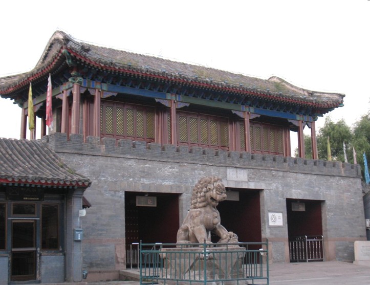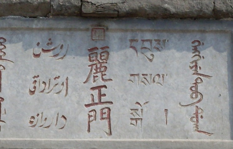 門前列石獅和下馬碑,迎面有紅照壁,門上有閣樓,下有3門,高敞宏偉。中門上方有乾隆題額“麗正門”三字,取《易經(jīng)》“日月麗乎于天”之意,用漢、滿、蒙、藏、維五種文字刻成。它和門內(nèi)上方乾隆題詩(shī)“兩字新題標(biāo)麗正,車書恒此會(huì)遐方”,象征著國(guó)內(nèi)各民族團(tuán)結(jié),國(guó)家強(qiáng)盛、統(tǒng)一。