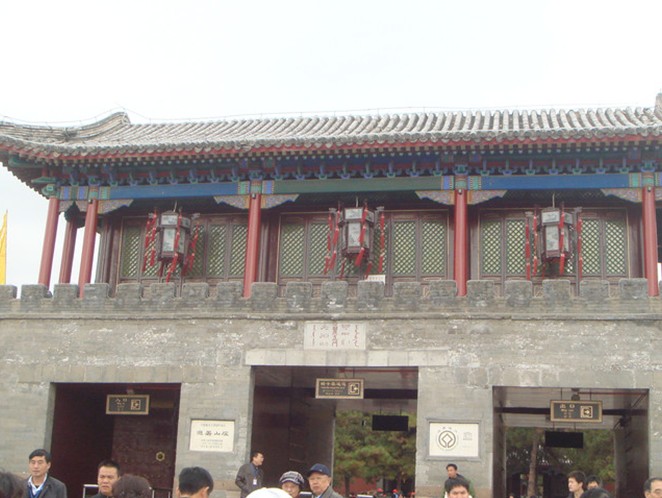 麗正門既是避暑山莊的正門,也是正宮的正門,建于乾隆十九年(1754年)。它是個(gè)重臺(tái)城門,有三個(gè)長(zhǎng)方形拱門入口,重臺(tái)上建有城閣三間。門前列石獅一對(duì),左右立下馬碑各一,迎面建有30米長(zhǎng)的紅照壁。布局規(guī)格嚴(yán)整,風(fēng)格質(zhì)樸秀麗,為避暑山莊的乾隆三十六景之首。
