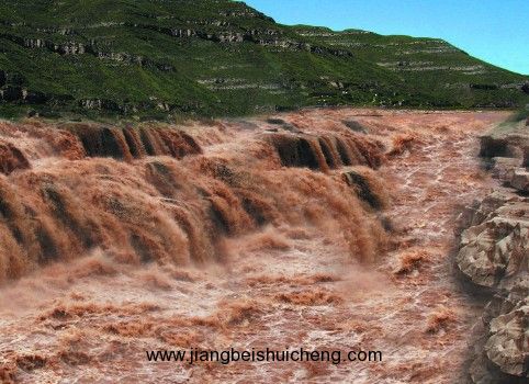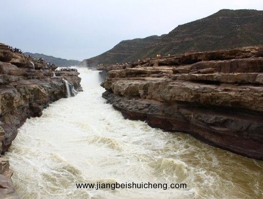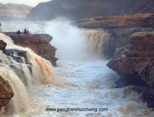 壺口瀑布是黃河中游流經(jīng)秦晉大峽谷時形成的一個天然瀑布。西臨陜西省宜川縣,東瀕山西省吉縣,距陜西省宜川縣城40公里,距山西吉縣城西南約25公里。瀑布寬達(dá)50米,深約50米,最大瀑面3萬平方米。是中國僅次于貴州省黃果樹瀑布的第二大瀑布。滾滾黃河水至此,300余米寬的洪流驟然被兩岸所束縛,上寬下窄,在50米的落差中翻騰傾涌,聲勢如同在巨大無比的壺中傾出,故名“壺口瀑布”。兩大著名奇景“旱地行船”和“水里冒煙”,更是罕見。亞洲飛人柯受良和黃河小子朱朝暉先后駕駛汽車和摩托車成功飛越黃河壺口瀑布景區(qū)。黃河壺口瀑布景區(qū)面積約100平方公里,為陜西省和山西省共有著名風(fēng)景名勝區(qū),1988年被定為國家重點風(fēng)景名勝區(qū),現(xiàn)為國家4A級景區(qū)。 此地兩岸夾山,河底石巖上沖刷成一巨溝,寬達(dá)30米,深約50米,滾滾黃水奔流至此,倒懸傾注,若奔馬直入河溝,波浪翻滾,驚濤怒吼,震聲數(shù)里可聞。其形如巨壺沸騰,故名壺口。春秋季節(jié)水清之時,陽光直射,彩虹隨波濤飛舞,景色奇麗。明陳維藩《壺口秋風(fēng)》詩有“秋風(fēng)卷起千層浪,晚日迎來萬丈紅”句,可謂真實寫照。