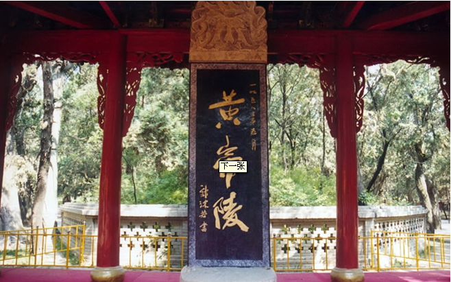 再北為誠心亭。面闊五間。進(jìn)深一間。祭祀官員至此須整飾衣冠,靜心凈面,方可進(jìn)入大殿祭祀。再北為碑亭,面闊五間,進(jìn)深一間,卷棚頂。亭內(nèi)立有毛澤東手跡“祭黃帝陵文”和蔣中正手跡“黃帝陵”碑石。