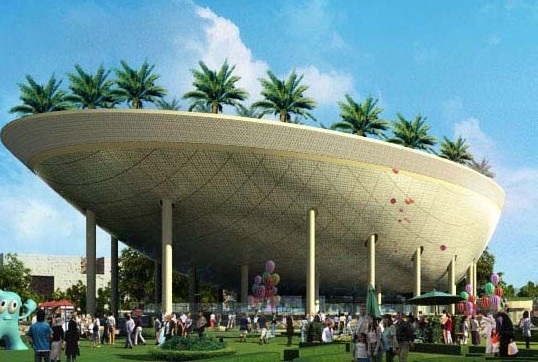 靈沙特阿拉伯展館感來自于沙漠中的綠洲,主體建筑更像一艘高懸于空中的大船,底部和甲板種滿了沙特標(biāo)志性植物:棗椰樹。