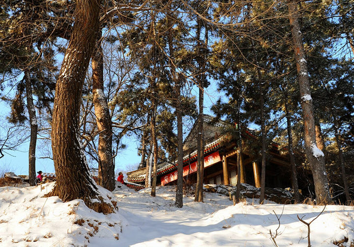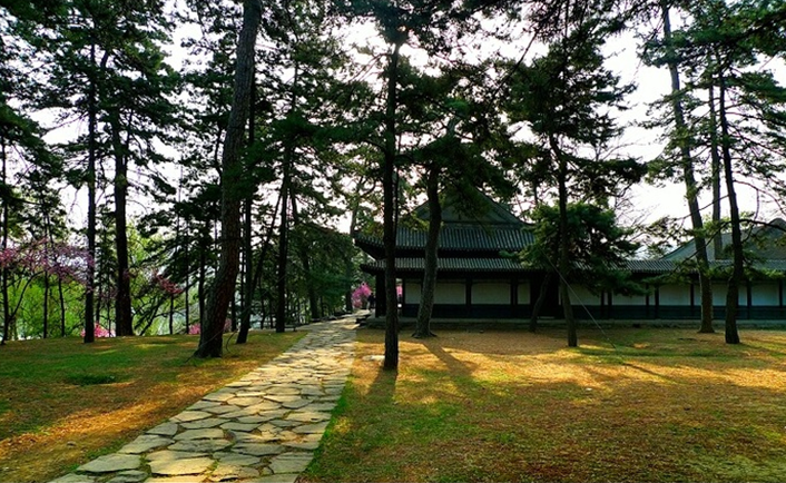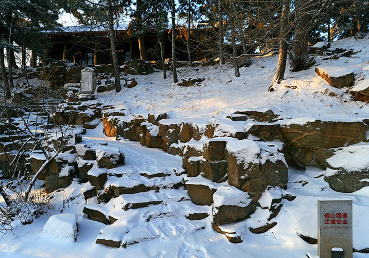構圖沒有采用其他山水畫家常用的“三遠法”,而是采用了“滿式構圖法” 。畫面上,山石嶙峋,最上端的立石突兀森嚴、造型古樸,給人一種高山仰止的視覺效果。在部分山石的突兀處加以留白,以少許苔點破之。畫中除了下半部用花青點染幾棵蒼松外,其余山石均以大面積的赭石、土黃和墨筆來皴擦、點寫、平涂,色彩對比強烈。左下角的坡石與上部山石用墨都較重,既起到了上下呼應的作用,版權所有山東聊城聊之旅國際旅行社有限公司,轉載必究!又起到了穩(wěn)定構圖的作用。