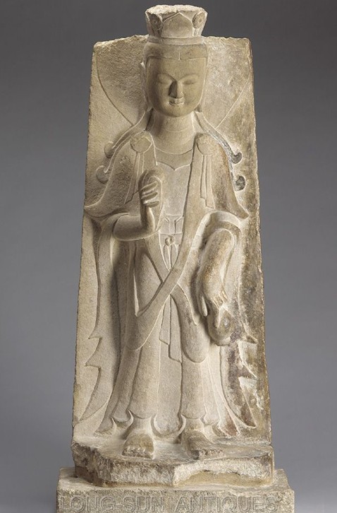 石像高3.9米,腰圍2米,手長40厘米,背北面南,立于50厘米高的石雕蓮花座上。石像刻線明顯,披巾搭胸,細腰束帶。雕線棱角分明,刀法洗煉,在個體石像中甚為罕見,為我國古代石雕珍品。現(xiàn)為省級重點文物保護單位。