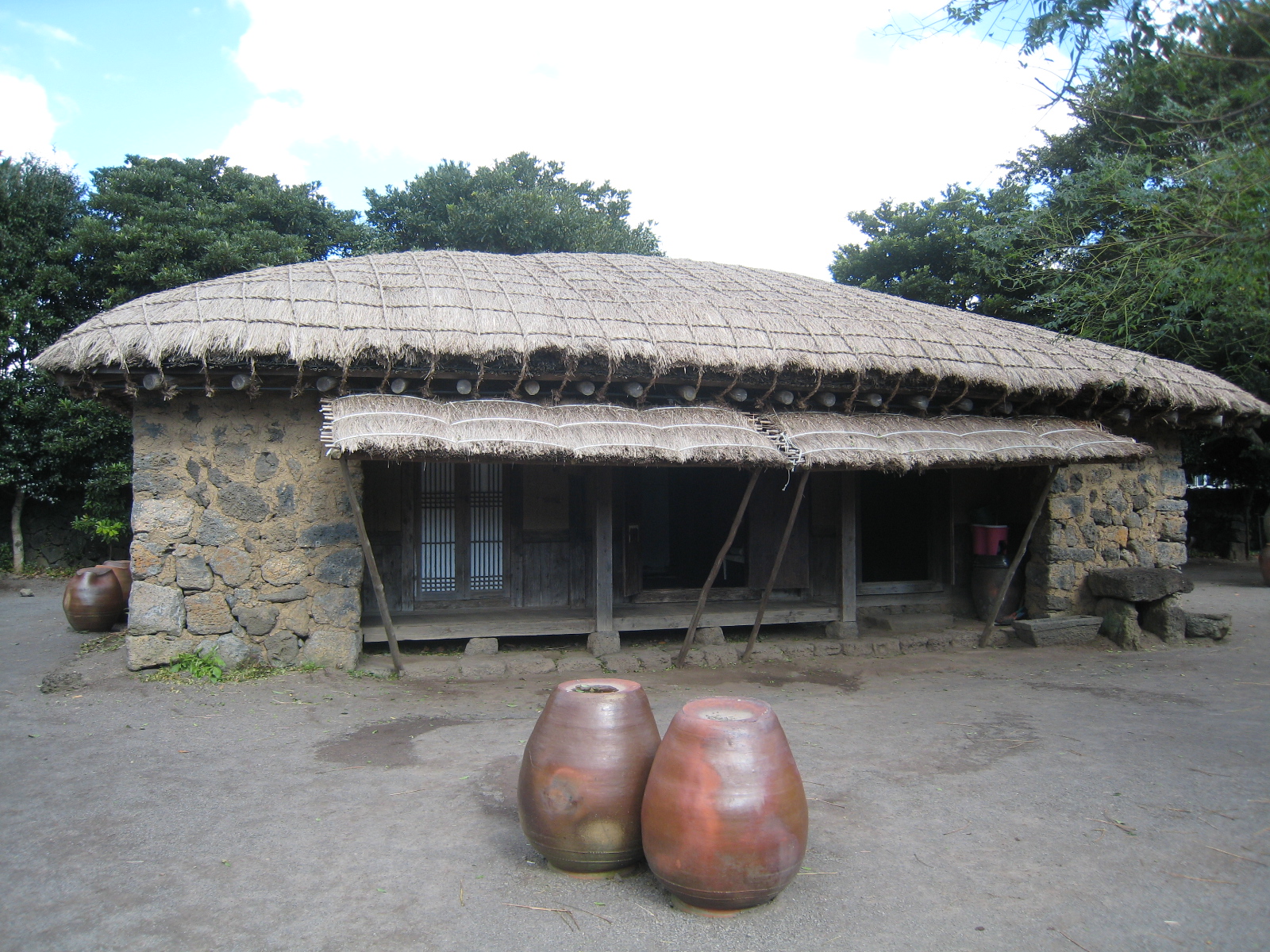 城邑民俗村由于位于濟(jì)州島上,因而也完全反映了濟(jì)州島獨(dú)特的居住文化。你在這里可以看到那看似堆得稀稀疏疏的擋風(fēng)石墻(黑熔巖石),為了防止風(fēng)直接進(jìn)入里屋而建得又直又彎的“奧來”(窄胡同),還有成為濟(jì)州島之象征的石神像(Dolharubang)。濟(jì)州島特有的東西中尤為有名的是黑毛的土種豬和“通西”(豬圈兼廁所)。這里的土種豬吃人糞,其營養(yǎng)豐富,肉味可口,十分有名。這里都是現(xiàn)代社會已難得一見的傳統(tǒng),因而更增添了幾分別樣風(fēng)味。
