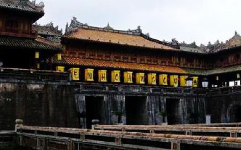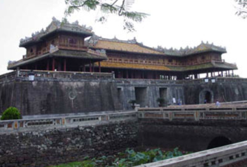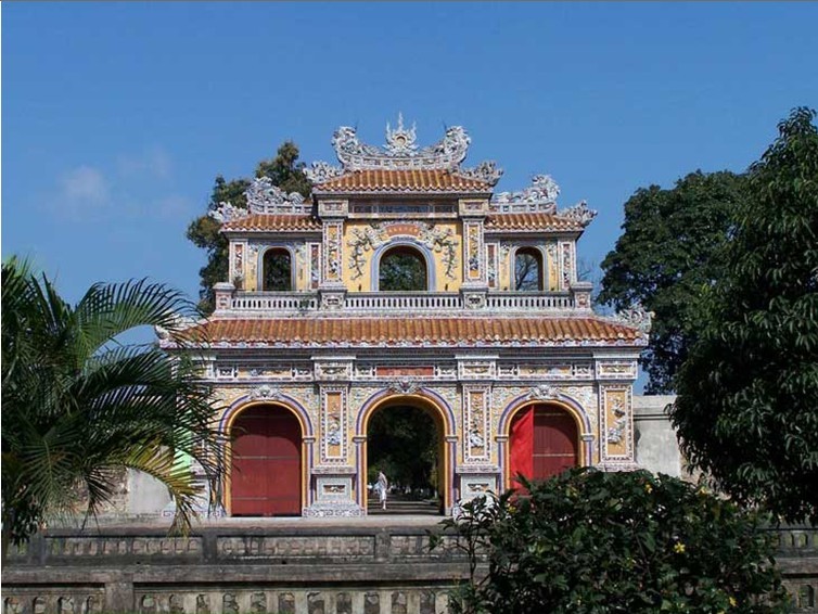 越南順化故宮正門。規(guī)模比中國北京故宮的午門小,但其式樣基本一樣。平面呈冂形,下有高大的磚石墩臺(tái),臺(tái)正面圍以垛墻。墩臺(tái)有5門,正中門高5.32米,寬3.28米,門正中上方有“午門”兩個(gè)大字。當(dāng)初字外包金,1943年12月10日包金被竊。墩臺(tái)上建樓5座,名五鳳樓,樓分兩層,氣勢巍峨。下層正中是“御座”。上層為各宮人觀禮之所。當(dāng)時(shí),午門只在慶典節(jié)日開放。午門也是阮氏王朝被埋葬的見證,1945年8月30日阮朝末代皇帝被迫在此正式宣布遜位,并把金印和寶劍交給越南臨時(shí)政府代表團(tuán)。午門建于阮朝明命十四年(公元1833年),啟定三年(1921年)重修??箲?zhàn)期間遭炮火破壞,現(xiàn)已修復(fù)。以前,阮朝嘉隆初年曾在午門現(xiàn)址建有南闕臺(tái)。