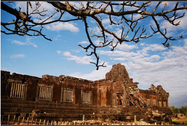 底部由位于一座巨大的方形水池邊緣的兩座宮殿建筑廢墟組成好,水池由一條用于洗禮儀式的雨道一分為二。上部是寺廟的大殿,里面曾經(jīng)供奉過(guò)一座巨大的濕婆生殖器。不過(guò)后來(lái),這座神廟被改成了佛教寺廟,但是原先的印度教雕刻還保留在了門(mén)檻上就在。濕婆生殖器大殿的北邊,有一座大象石和一座神秘的鱷魚(yú)石。通往圣殿的神龍(naga)臺(tái)階兩側(cè)是成排的紫薇花(dokjampa)樹(shù)。在上層的平臺(tái)上面可以俯瞰道腳下壯觀的湄公河河谷。
