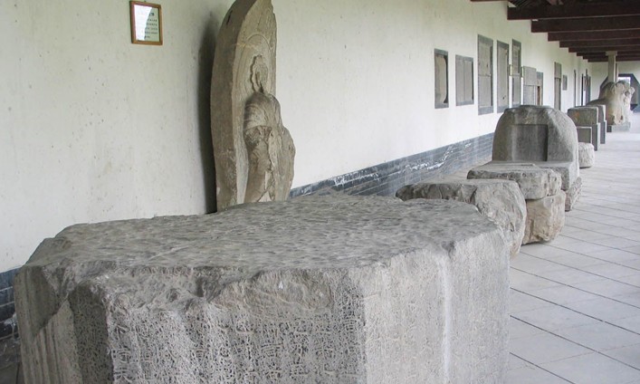 北魏阿彌陀佛說(shuō)法石造像,高5.85米,現(xiàn)藏青島市博物館,俗稱丈八佛。庭院內(nèi)露天陳列許多珍貴文物,其中院東側(cè)護(hù)欄內(nèi),坐東面西、南北向并列4尊雕刻精美的北朝石刻造像和兩座石碑。中間兩尊石像高達(dá)一丈八尺,故稱“丈八佛”。佛像身軀微傾,雙目細(xì)長(zhǎng),彎如新月,目光下視,面含微笑,兩腳跌立于刻有蓮花的石座上,顯示了距今1400多年前北朝時(shí)代宗教藝術(shù)的偉大成就。