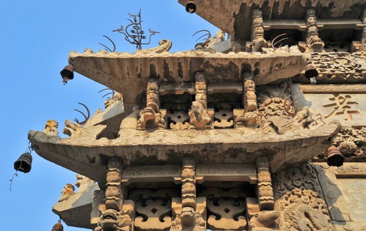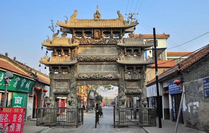 百壽坊俗稱朱家牌坊,位于單縣城內勝利北街,乃清乾隆三十年(1765年)為翰林院孔目贈儒林郎朱叔琪妻孔氏而建,因雕有一百個不同書體的壽字而得名。坊以青色魚子狀石灰?guī)r構成,通高l3米、寬8米,四柱三間三層樓閣式建筑。其獨特之處是:坊座雕有8頭矯健雄獅昂首遠望,8條出水蚊龍繞柱回舞,額枋上飾滿盛開牡丹,與正間上下額枋祥云間翩翩飛舞的5只透雕仙鶴、次間上額枋浮雕的相對翱翔之鸞鳳構成了具有無窮魅力之藝術佳作,寓意福壽萬年、富貴無媲或喜上眉梢。