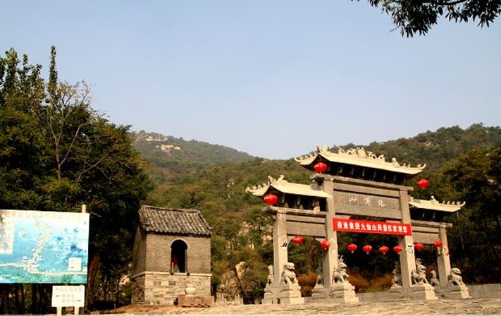 九仙山同泰山一樣,也有“一天門”、“中天門”和“南天門”。然而,一天門距中天門雖十幾米,但石階陡峭。須步步登高。也不是一件輕松的事。進(jìn)入中天門,再拾級(jí)住上,方到達(dá)南天門。新修復(fù)的南天門座北朝南,矗立于一生片高峻的巨石之上,從下面仰視,好像置于蒼穹白云之間,氣勢(shì)凌厲,分外雄壯。