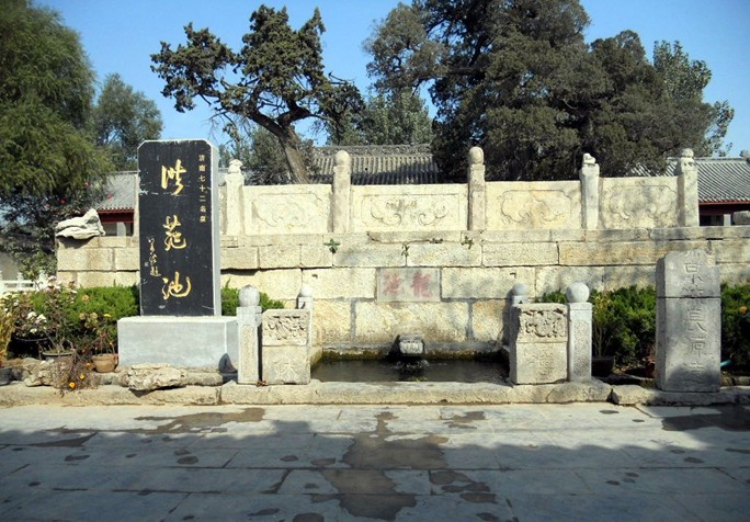 洪范池 又名“龍池”,在洪范池泉群中,最為著名。池名源于《尚書?洪范》,取其洪水就范之意。據(jù)池前清道光十八年《重修洪范池碑記》載:金完顏時(shí),龍池呈正 方形,四周石砌。邊長各7米,水深約6米,清澈見底。池底及四壁散泉緩緩浸溢,日涌量約1000立方米,水自池壁南側(cè)的石雕龍口中涌出,跌入一2米見方的小池中,繞池一周后匯入狼溪河。泉水流經(jīng)的 地方叫月河,河上有月河橋。