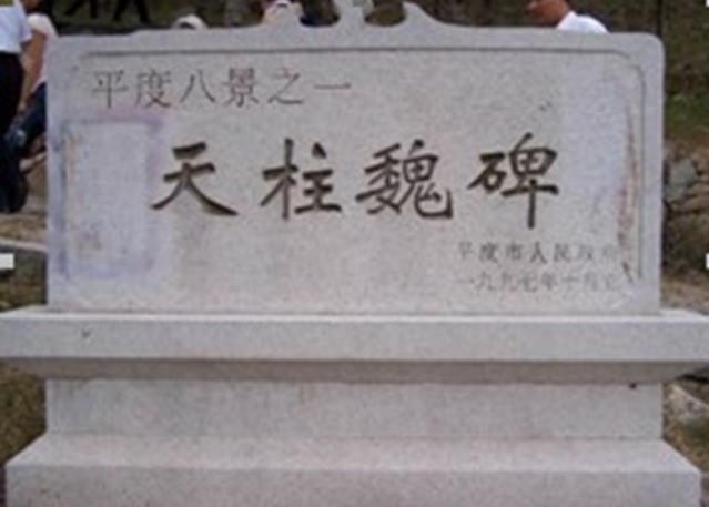 天柱山魏碑位于平度大澤山天柱山南,又稱天柱山摩崖石刻,為國家重點(diǎn)文物保護(hù)單位。碑文刻在一塊天然巨石上,高3.2米,寬1.5米,陰文20行,每行40至50字不等,共計(jì)881個(gè)字,碑文1400余年至今仍清晰可辨。該碑是北魏永平四年(511)光州刺史鄭道昭所書鐫,碑文記述了其父持節(jié)將軍兗州刺史南陽公鄭羲的生平事跡和著述。