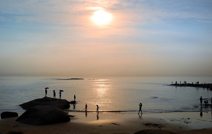 3、老爺頂觀日出 :為阿掖山主峰,其石“巍峨峭拔,紱繞如椅望”。立于其上,向東可觀日出扶桑,飄渺三島(即前三島),南視“秦山(海州灣內(nèi)——島嶼)海市”為佳景,令人嘆絕。夜眺景色更佳,北望日照港十萬噸級碼頭如龍臥波;南望嵐山港燈火輝煌,燦若繁星;遠望連云港巨輪穿梭,燈火通明,一山觀三港,唯有此處。