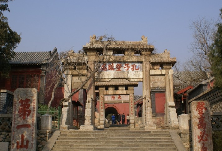孔子登臨處位于泰山一天門北,為四柱三門式跨道石坊。古藤掩映,典雅端莊,額題“孔子登臨處”五大字。明嘉靖三十九年 (1560)始建。柱聯(lián)曰:“素王獨步傳千古,圣主遙臨慶萬年”。坊兩側(cè)分立兩碑,東為明嘉靖間濟南府同治翟濤題“登高必自”碑;西為巡撫山東監(jiān)察御史李復初題“第一山”碑。北側(cè)為兩柱單門的“天階”坊。