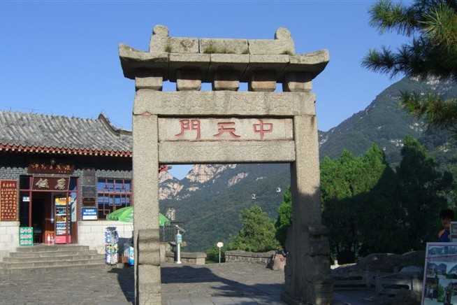 中天門建于清,為兩柱單門式石坊。泰山古時多虎,古人在坊北建廟祀黑虎神,現(xiàn)廟內(nèi)塑財神趙公元帥執(zhí)鞭跨虎,東為仿古茶樓,西南為中溪賓館,西北為中天門索道站。