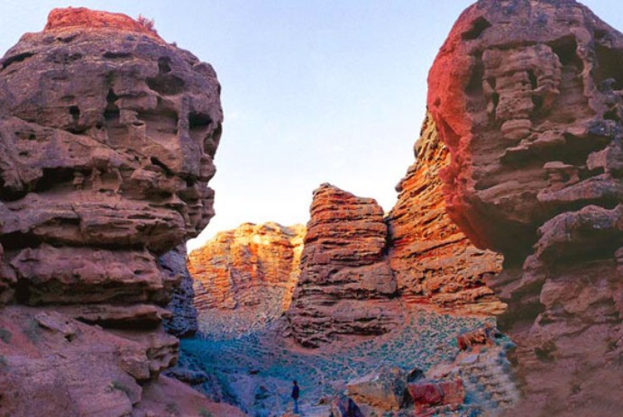 進入峽谷漸行漸遠,眼前景致的獨特讓人感到無比驚訝,只有發(fā)自內(nèi)心地贊嘆大自然的鬼斧神工,不由地想起兩句古詩:遠看成嶺側成峰,遠近高低各不同。同一座山峰,從不同角度看、從不同的人眼中看,風景都不一樣,甚至有藝術靈感的人可以運用抽象思維,讓面前的山峰變幻成更多畫面,而自己的思想就像野馬馳騁在寬闊的原野上,在抽象世界冥想,沉浸其中無法自拔。