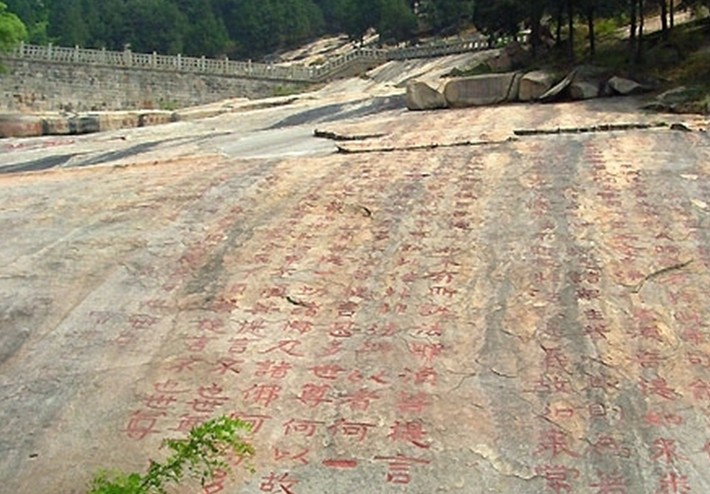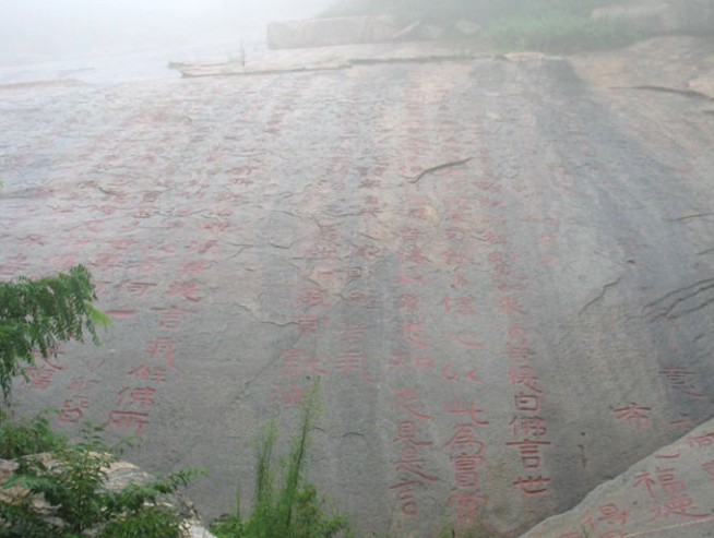 經(jīng)石峪金剛經(jīng)刻位于斗母宮東北經(jīng)石峪,是中國現(xiàn)存規(guī)模最大的佛經(jīng)摩崖刻石。 經(jīng)文刻于面積2064平方米的緩坡石坪上,自東而西刻《金剛般若波羅密經(jīng)》,采用后秦鳩摩羅什譯本,原本全1卷、32分目、5172字,經(jīng)刻只刻到15分目“特經(jīng)功德 兮”,計44行,每行125字或10字不等,凡2799字,字徑50厘米。經(jīng)刻歷千余年風(fēng) 雨剝蝕、山洪沖擊、游人踐踏、捶拓?zé)o度,已殘泐磨滅過半,現(xiàn)僅存經(jīng)文41行、 1069字(包括可認(rèn)讀的殘字和雙勾字)。