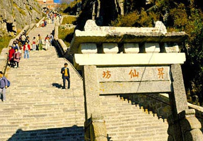升仙坊位于山東省泰山中路緊十八盤的起始處,為兩柱單門式石坊,額題楷書“升仙坊”。此處山勢(shì)陡峻,懸崖峭壁,上臨岱頂天庭,咫尺仙境,似有飄然升仙的意境,故名“升仙坊”。游人至此小憩,每每浮想聯(lián)翩?;匾暽较?,常有騰身云霄之感,舉首仰望,南天門近在眼前,奮力攀登,岱頂在望。