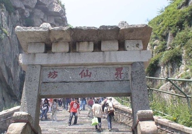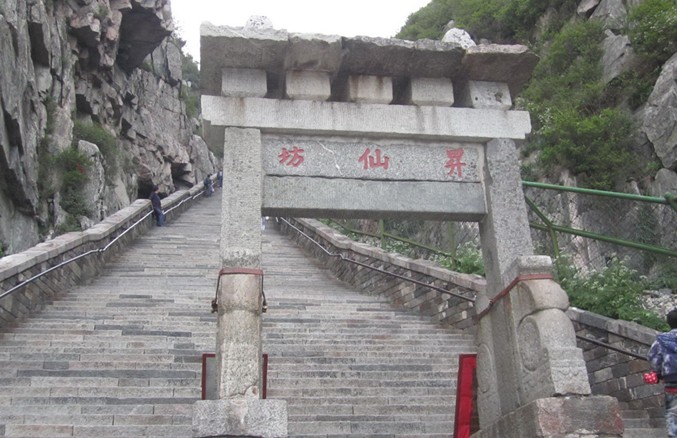 升仙坊位于山東省泰山中路緊十八盤的起始處,為兩柱單門式石坊,額題楷書“升仙坊”。此處山勢(shì)陡峻,懸崖峭壁,上臨岱頂天庭,咫尺仙境,似有飄然升仙的意境,故名“升仙坊”。游人至此小憩,每每浮想聯(lián)翩。回視山下,常有騰身云霄之感,舉首仰望,南天門近在眼前,奮力攀登,岱頂在望。 升仙坊位于南天門下。全石雙柱單門式,寬2.82米,通高4.5米,建于雙層方 石基上。基石長(zhǎng)1.82米,寬0.64米,高0.5米。柱方形,下施滾墩石,獸頭石鼓狀。
