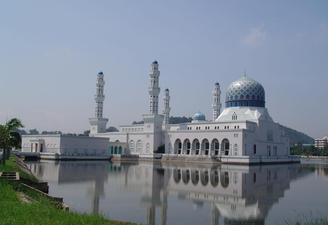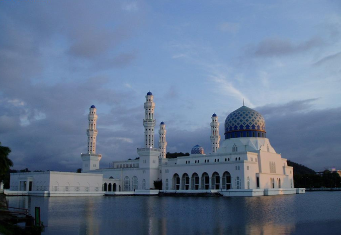 哥達京那巴魯市立清真寺座落在里卡士灣畔(Likas Bay),是一座典型的當(dāng)代伊斯蘭教建筑,是馬來西亞夕陽景觀最壯麗的清真寺之一。它建于里卡士灣的人造湖上,感覺有如浮在水面之上,因而得到“水上清真寺”的美稱。令人驚嘆的白色建筑物造型,與藍(lán)天完美的連成一體。清真寺于1997年建成,占地一公頃,可容納最多12,000名教徒祈禱。