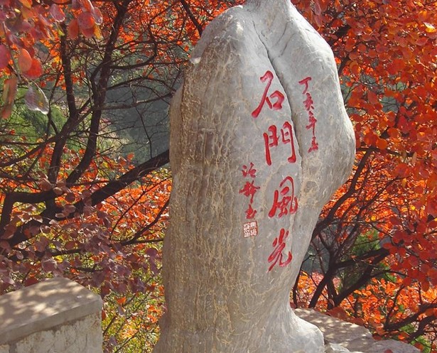 石門坊群峰環(huán)翠,壁立千仞,嶙峋夔石,青者如黛,白者如堊,峭者 如削,剝者如脫。紅葉黃櫨遍布山崗峽谷,每值深秋,霜打紅葉,潑染山紅;叢櫨間柏,漫紅嵌黛,丹青麗雅,瑰麗如畫。重陽時節(jié),中外游客 慕名觀賞石門紅葉,絡(luò)繹不絕。