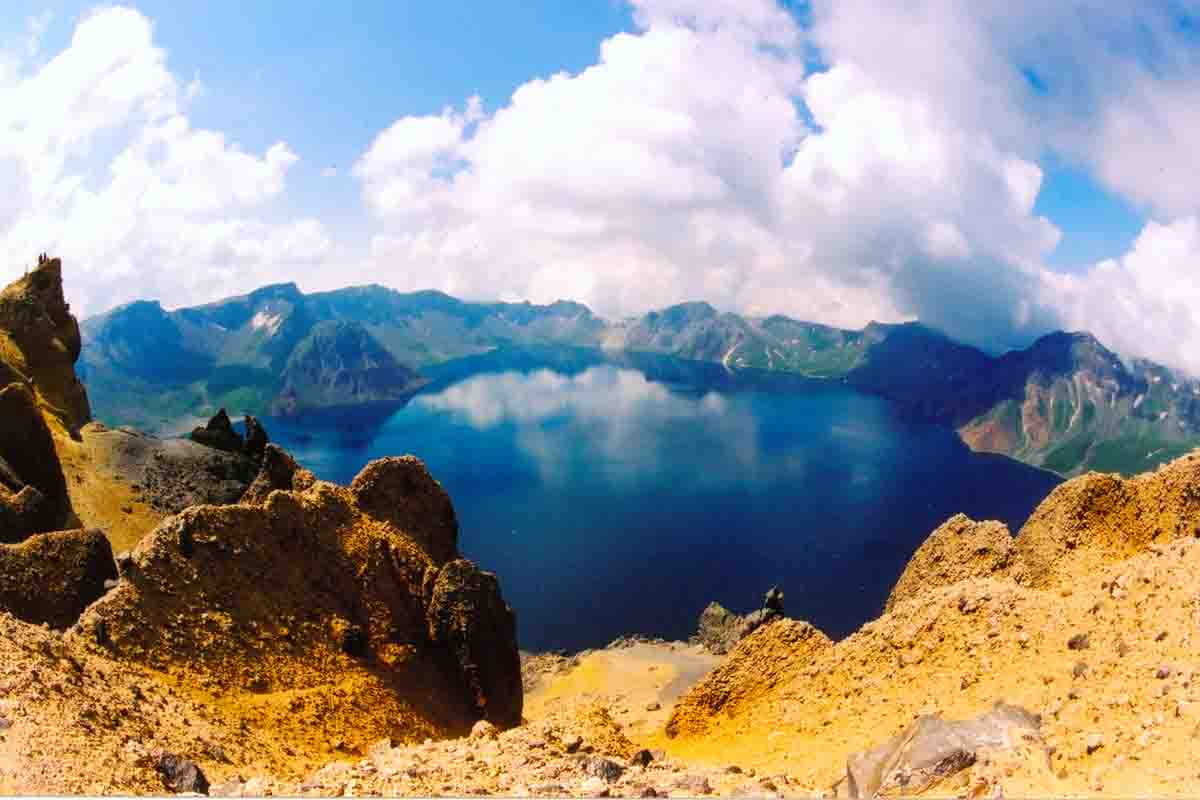長白山天池位于長白山主峰火山錐體的頂部,是一座火山口,經(jīng)過漫長的年代積水成湖。長白山天池海拔2189.1米,比新疆維吾爾自治區(qū)的天山天池高209米。天池略呈橢圓型,南北長4.4公里,東西寬3.37公里。集水面積21.4平方公里,水面面積9.82平方公里,水面周長13.1公里,平均水深204米,最深處達373米??傂钏?0.4億立方米。天池水溫為0.7°C——11°C,年平均氣溫7.3°C。天池像一塊瑰麗的碧玉鑲嵌在雄偉的長白山群峰之中,它是中國最高最大的高山湖泊。是東北三條大江——松花江、鴨綠江、圖們江的發(fā)源地。柔美的天池白云繚繞,五色斑斕波光嵐影,群峰環(huán)抱,蔚為壯觀。天池上空氣候多變,多云、多霧、多雨、多雪,云、霧、雨、雪把天池不僅裝點得美麗動人,而且更加虛幻神秘,迷迷茫茫。尤其盛夏季節(jié),風雨不定,變化頻繁,有時一日之內(nèi),甚至一小時之內(nèi)就可能發(fā)生幾次變化,剛剛還是驕陽直射、焦灼烤人,忽然間狂風大作、黑云滾滾、電閃雷鳴,大雨傾盆,山峰、湖面傾刻間淹沒在風雨之中了……一會又風和日麗,山峰、湖面又重新展露出來。雨后天池景色格外迷人,池邊群峰競秀,山野如洗;池上霞光萬道,長虹當空;池中奇峰倒映,波光粼粼。天池上空經(jīng)常云霧繚繞,置身其中使人頓覺騰云駕霧一般,白云在腳下飄逸。給人一種神秘莫測、飄飄欲仙的美感。有時還會出現(xiàn)池東日出池西雨,山上大雨,山下晴的奇異景觀。