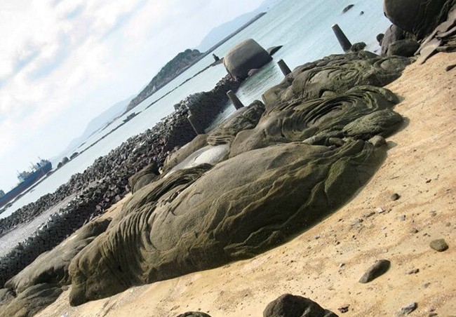 與半洋石帆相對應(yīng),在看澳村海邊,由于海水侵蝕和自然風化,巖壁花崗巖風化,形成一座光頭凸肚的彌勒佛像。石像曲膝盤坐,身高12米,肩寬12米,頭、身、手、足畢現(xiàn),形象生動,狀如半浮雕。版權(quán)所有山東聊城聊之旅國際旅行社有限公司,轉(zhuǎn)載必究!圍繞佛身有一條棕黃色的火成巖脈,就象獻給佛像的一條金色“哈達”,也是自然巧合 ,佳趣天成。另外,這里還有許多天然海蝕景觀,例如雙龜接吻,青蛙等,值得一看。