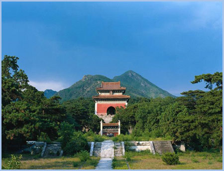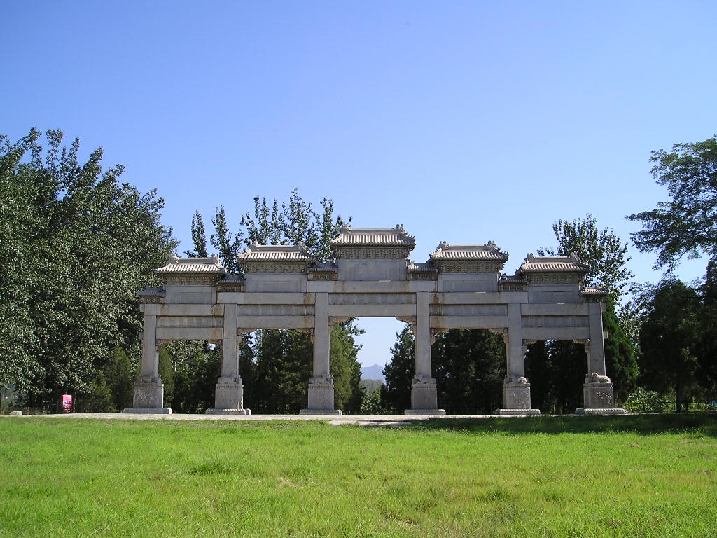 大紅門 坐落于陵區(qū)的正南面,門分三洞,又名大宮門,為陵園的正門。大門兩旁原各豎一通石碑,上刻"官員人等至此下馬"字樣。凡是前來祭陵的人,都必須從此步入陵園,以顯示皇陵的無上尊嚴(yán)。大門兩側(cè)原設(shè)有兩個角門,并連接著長達(dá)80華里的紅色圍墻。在蜿蜒連綿的圍墻中,另設(shè)有一座小紅門和十個出入口,均派有重兵駐守,是百姓不可接近的禁地?,F(xiàn)在這些圍墻都早已坍塌,有些殘跡尚依稀可辨。