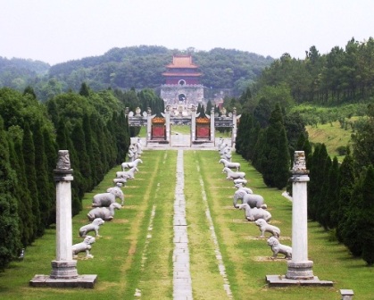 石雕群 是陵前放置的石雕人、獸,古稱石像生(石人又稱翁仲)。從碑亭北的兩根六角形的石柱起,至龍鳳門止的千米神道兩旁,整齊地排列著24只石獸和12個石人,造型生動,雕刻精細(xì),深為游人所喜愛。其數(shù)量之多,形體之大,雕琢之精,保存之好,是古代陵園中罕見的。石獸共分6種,每種4只,均呈兩立兩跪狀。將它們陳列于此,賦有一定含義。例如,雄獅威武,而且善戰(zhàn);獬豸為傳說中的神獸,善辨忠奸,慣用頭上的獨(dú)角去頂觸邪惡之人。獅子和獬豸均是象征守陵的衛(wèi)士。麒麟,為傳說中的"仁獸",表示吉祥之意。駱駝和大象,忠實(shí)善良,并能負(fù)重遠(yuǎn)行。駿馬善于奔跑,可為坐騎。石人分勛臣、文臣和武臣,各4尊,為皇帝生前的近身侍臣,均為拱手執(zhí)笏的立像,威武而虔誠。在皇陵中設(shè)置這種石像生,早在兩千多年前的秦漢時期就有了。主要起裝飾點(diǎn)綴作用,以象征皇帝生前的儀威,表示皇帝死后在陰間也擁有文武百官及各種牲畜可供驅(qū)使,仍可主宰一切。