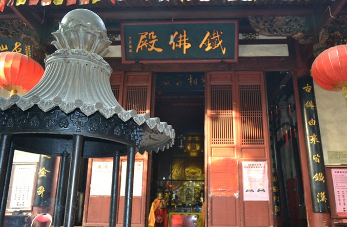 鐵佛殿內(nèi)有鐵佛一尊,稱“阿彌陀佛”,疊掌跏趺坐于蓮花臺上,外披泥貼,法相莊嚴。鐵佛高5.3公尺,頭部實心,身軀空心,人立其肩上,伸手摸不到頭頂,估計重量達十萬斤以上。清乾隆時陳云程《閩中摭聞》載,鐵佛殿前柱子兩側(cè)刻有明末舉人曾異所撰楹聯(lián):“古佛由來皆鐵漢,凡夫但說是金身。”
