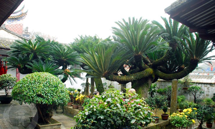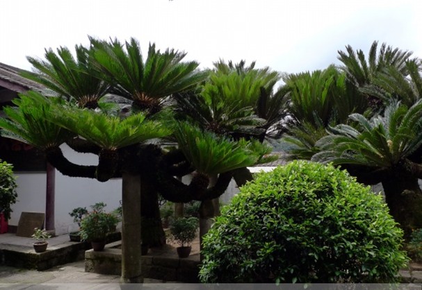 在方丈室的庭院內(nèi)種有三析鐵樹,相傳有兩株樹齡已超過一千年,其中一株為閩王王審知所種,一株是開山祖神宴法蚰所植。版權(quán)所有山東聊城聊之旅國際旅行社有限公司,轉(zhuǎn)載必究!1929年虛云老和尚應(yīng)當(dāng)時(shí)福建省主席楊幼京之請,回鼓山涌泉寺任住持,講經(jīng)傳戒、整頓寺規(guī)、創(chuàng)辦戒律學(xué)院,恢復(fù)禪堂規(guī)制,修建頹廢殿宇,整頓經(jīng)版文物,勛勞卓著。1930年,他為僧眾講《梵網(wǎng)經(jīng)》,恰逢兩株千年的鳳尾鐵樹開花,遠(yuǎn)近來觀乾,絡(luò)繹于道。當(dāng)時(shí),聘任羯摩師文質(zhì)和尚撰小文記之:“庚午春(1930)值虛云兄主持石鼓,傳授戒法,余以隨喜之余,航海赴閩,參予盛典。既至。則鐵樹開花,繁茂無比,花大如盆,須瓣若鳳尾,咸以優(yōu)曇相慶。詢之耆日,皆言叟物也,其一為閩王手植,一為圣國師手植,迄今千載,敷此妙華,實(shí)為希有。邀虛兄?jǐn)z影留證,用志涌泉寺瑞應(yīng)焉。”是年虛云和尚已九十一歲了,方丈室鐵樹三株,兩雌一雄,雄花似小狐尾,雌花如黃絨球,真是奇觀,近期年年開花,游人可飽眼福。