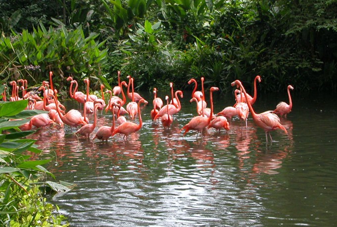 新加坡的裕廊飛禽園內(nèi)建有95個(gè)鳥舍、10個(gè)活動(dòng)場所和6個(gè)池塘,養(yǎng)有380多種飛鳥,約4600只,其中有29種受威脅鳥類。園內(nèi)廣泛搜羅了東南亞及世界各地的鳥類,有來自西班牙的紅鶴、來自北京的知更鳥、來自幾內(nèi)亞的食火雞、來自巴西的三趾鴕鳥、有羽毛絢麗的熱帶鳥和來自冰天雪地的南極企鵝等,是個(gè)“花木四時(shí)茂,人來鳥不驚”的“鳥類王國”。園中修建有四通八達(dá)的柏油小徑,不愿步行者也可選游覽車。