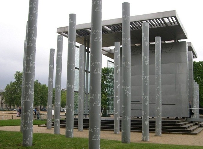 遠(yuǎn)處就能夠看到紀(jì)念碑那高達(dá)70米的碑身高聳入云。四支錐形的白色石柱,組成一座巨大的錐形石塔,插入藍(lán)天,象征新加坡的華裔、馬來人、印度裔和歐亞裔所共同擔(dān)負(fù)的苦難和精神。紀(jì)念碑四周環(huán)繞著碧水,方形基座的南北兩面由石階分成四個面,分別由四種文字寫著“日本占領(lǐng)時期死難人民紀(jì)念碑 1942-1945”。沿石階而行,穿過水池,來到紀(jì)念碑的中心。在四支石柱上,各自有一面銘文,記錄著紀(jì)念碑建立的始末。而在整個建筑的中央,有一尊半人高的方形石臺,四面都有不同文字的銘文,中文部分這樣寫道: