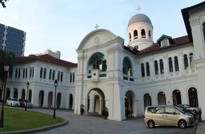 新加坡美術(shù)館坐落在新加坡最早的天主教學(xué)校圣約瑟書院舊址,這組保留完整的古希臘修道院式建筑,在新加坡十分罕見,中央建筑有兩個(gè)特征,一是成為勿拉士巴沙路象征的“三公仔”銀色塑像(中間的塑像就是基督教會(huì)學(xué)校修士學(xué)院的發(fā)起人圣約翰),二是它的銀色圓形頂樓,圓頂上還有一個(gè)十字架。