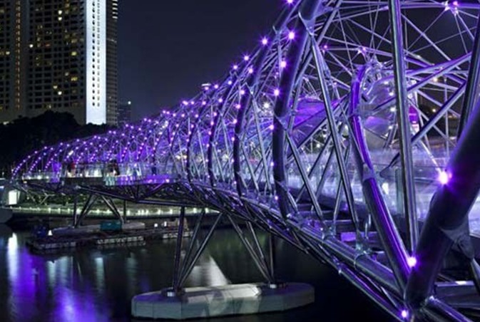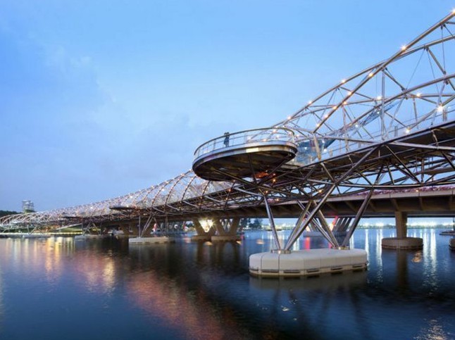 新加坡雙螺旋橋,位于新加坡濱海灣,長280米、寬6米的人行橋。新加坡雙螺旋橋是世界上首座雙螺旋人行橋。業(yè)主單位是新加坡市區(qū)重建局(URA)和 陸路交通管理局(LTA)。于2010年4月24日建成通行。新加坡雙螺旋橋于2007年3月底動工建造。設(shè)計人員受DNA結(jié)構(gòu)的啟發(fā),這座橋梁想要體現(xiàn)的意義是“生命與延續(xù)、更新與成長”。