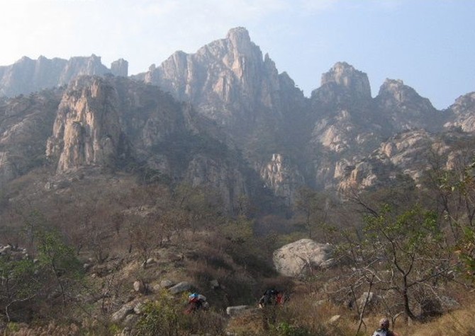 蓬萊崮山雙峰并起,高入云端,南崮海拔510米,山巔有龍興寺,尚存金代刻石多處。北崮海拔542米,有兩條登山通道,其一順巨石巖隙,蜿蜒而上,路窄坡陡,俗稱“梯子口”;其二為人工開鑿的盤石路,路一側(cè)直臨崖頭,極其險峻。山巔平坦,有插旗頂、飲馬灣、西校場、龍墩、繡墩等景點和古代屯兵足跡。