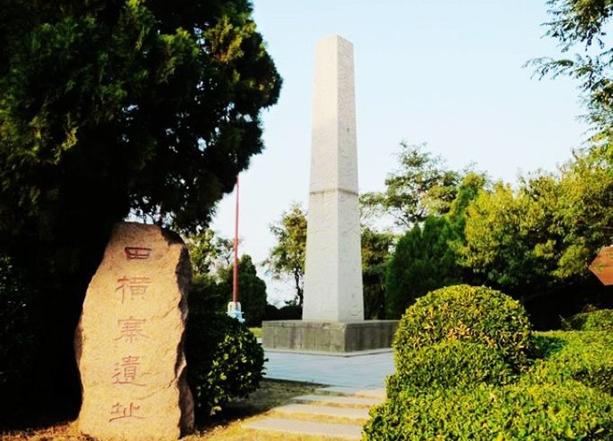 這里是田橫寨遺址,為長方形,東西長120米,南北寬80米。南側(cè)的“田橫寨遺址”石碑為書法家大康題寫。這座田橫紀(jì)念柱高7米,采用花崗巖雕鑿而成。四面浮雕分別表現(xiàn)了“聚事”、“演練”、“進攻”、“建國”四個場面。西側(cè)是一座田橫雕像。他面北而立,氣宇軒昂,象似在高呼“吾豈能北面而事臣?”雄姿凜然,氣壯山河。