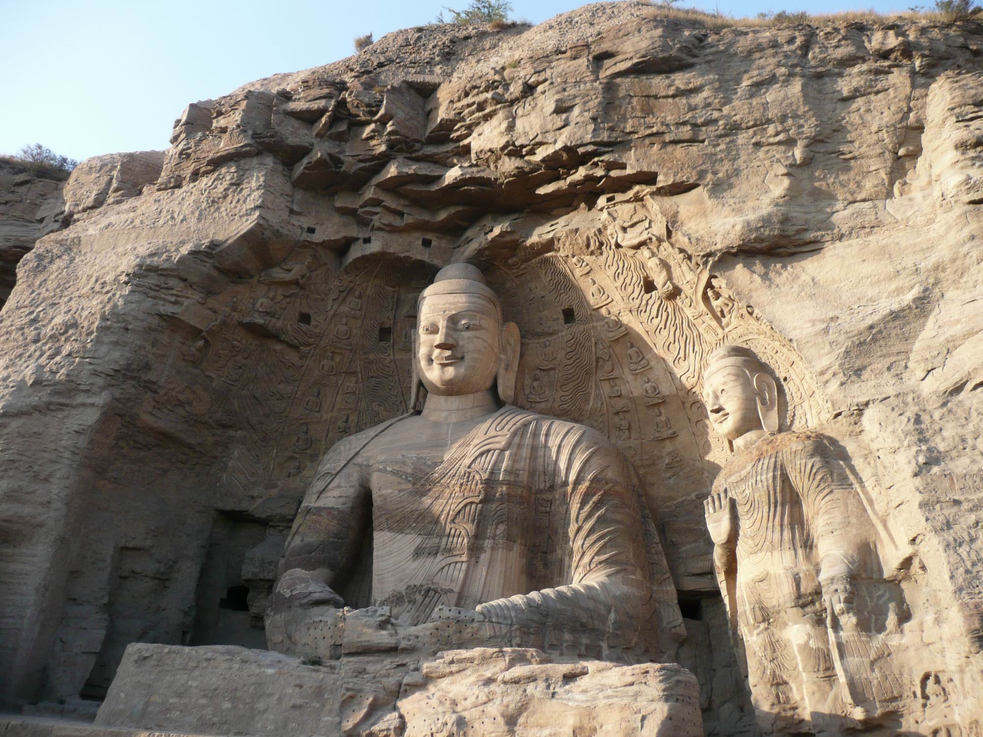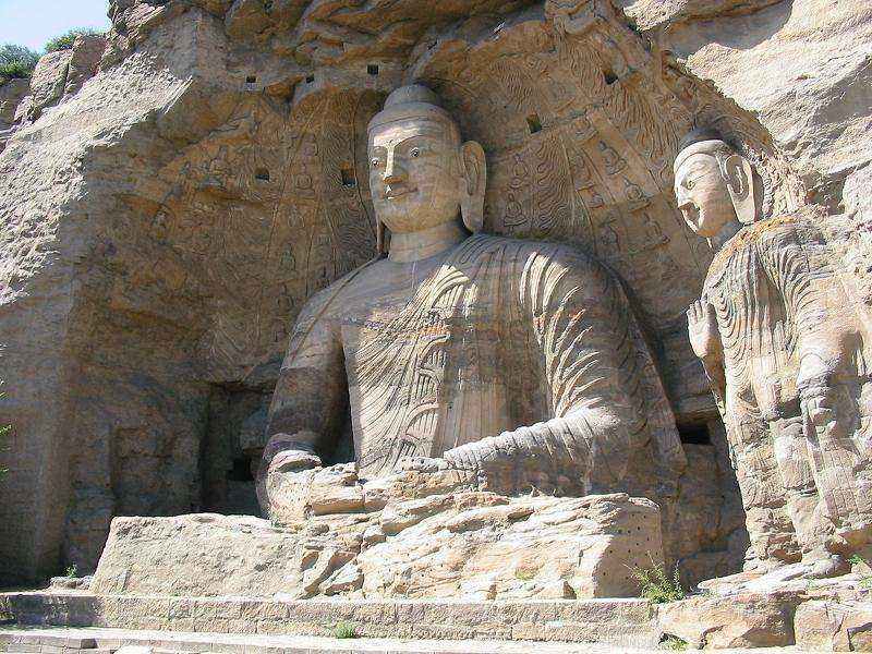 第十九窟,主像是三世像,窟中的釋迦坐像,高16.8米,是云岡石窟中的第二大像??咄鈻|西鑿出兩個(gè)耳洞,各雕一身8米的坐像。