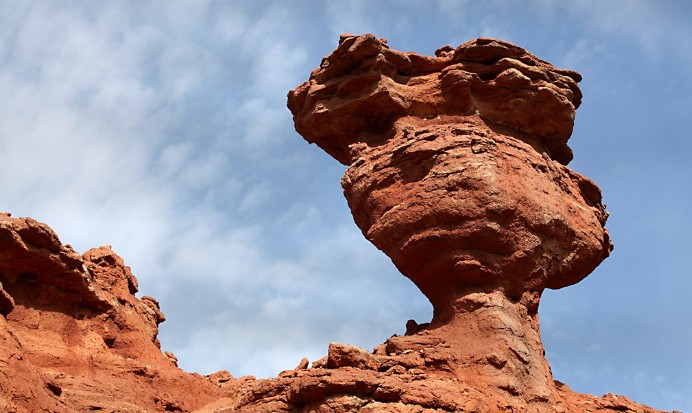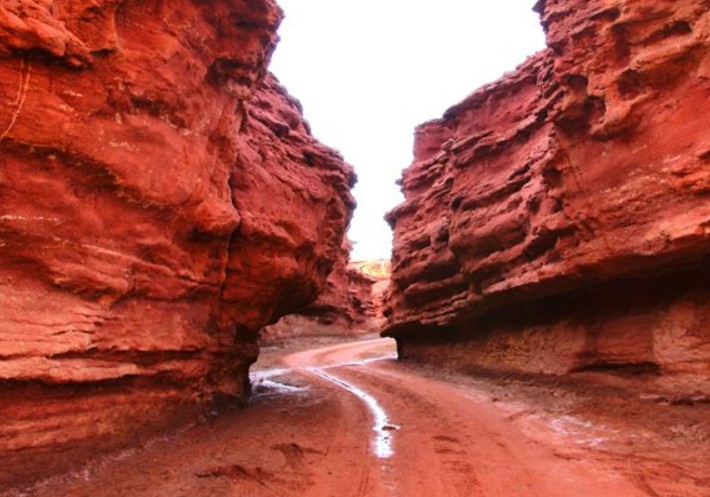峽谷由深紅色的沙石構成,全長5公里,在藍天、白云的襯托下,瑰麗無比,氣勢恢弘。峽谷經(jīng)歷萬年的風剝雨蝕,洪水沖刷,而今滄桑壯美。置身其間,峰回路轉(zhuǎn),一步一景,十步不同天,仿佛步入夢幻世界。峽谷中有一塊紅色巨石,看其普通,但其白色的沙紋竟然驚現(xiàn)出蒙文“阿拉善”三個字,令人驚奇。