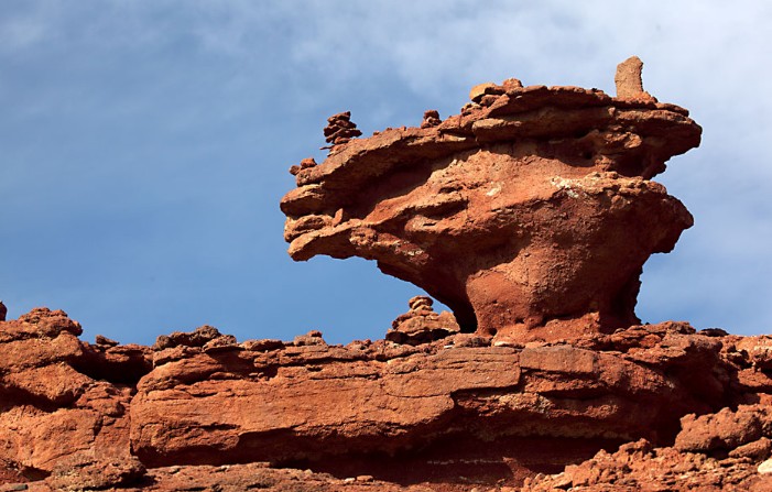 在不遠處的另一條山谷中,人們驚奇地發(fā)現(xiàn)一根巨大的石柱直指青天,柱體呈褐紅色,高20多米,粗可十人合圍,偉岸挺拔,直刺藍天,惟妙惟肖,形狀酷似男性生殖器官,人稱“人根峰”。百年前,有少數(shù)民族筑廟宇于其側(cè),曰“紅塔寺”,香火百年不衰,不育男女不遠千里來跪拜,求上蒼賜子。