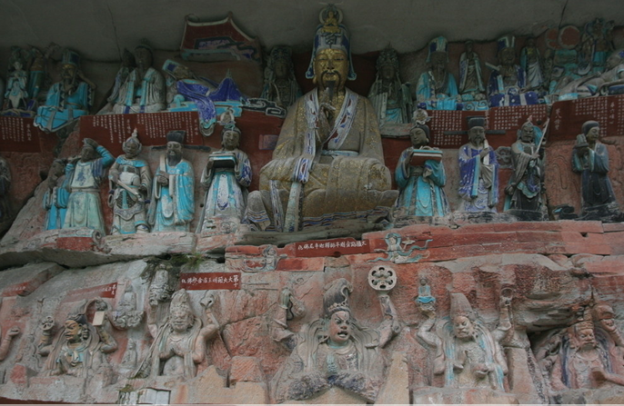 它是一個(gè)九層的遮檐,也叫“北大像”,正處在崖窟的中段,與崖頂?shù)雀?,巍峨壯觀。其木構(gòu)為土紅色,檐牙高啄,外觀輪廓錯(cuò)落有致,檐角系鈴,隨風(fēng)作響。其間有彌勒佛坐像,高35.6米,由石胎泥塑彩繪而成,是中國國內(nèi)僅次于樂山大佛和榮縣大佛的第三大坐佛。容納大佛的空間下部大而上部小,平面呈方形。樓外開兩條通道,既可供就近觀賞大佛,又是大佛頭部和腰部的光線來源。這座窟檐在唐文德元年(888年)以前就已存在,當(dāng)時(shí)為5層,北宋乾德四年(966年)和清代都進(jìn)行了重建,并改為4層。1935年再次重修,形成現(xiàn)在的9層造型。