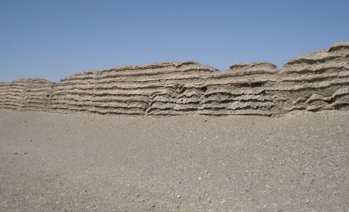 敦煌漢塞沿疏勒河南岸,由東向西延伸。西漢的塞墻止于疏勒河下游榆樹泉盆地東側(cè)的馬迷兔,在現(xiàn)敦煌市境內(nèi)長約 145公里,其間有大、小方盤城和馬圈灣等烽燧遺址,一般保存較好。塞墻構(gòu)筑多因地制宜,就地取材。在湖灘、沼澤地區(qū),塞墻多先以蘆葦束作框架,內(nèi)填砂礫,再平鋪蘆葦層,如此層層疊壓而上,底寬約 3米,頂寬約1.5米,現(xiàn)存最高者約3.75米。戈壁地區(qū)多產(chǎn)紅柳,則以紅柳枝束為框架,筑法與蘆葦作材料者相同。